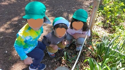 2歳の子ども達は裸足になって園庭で遊んでいますよ。