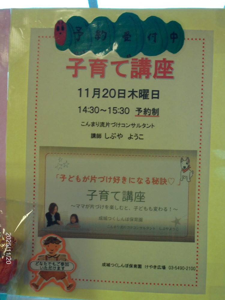 渋谷陽子さん(元、成城つくしんぼ保育園職員です)を講師に「子どもが片付け好きになる秘訣♡」がテーマでした。