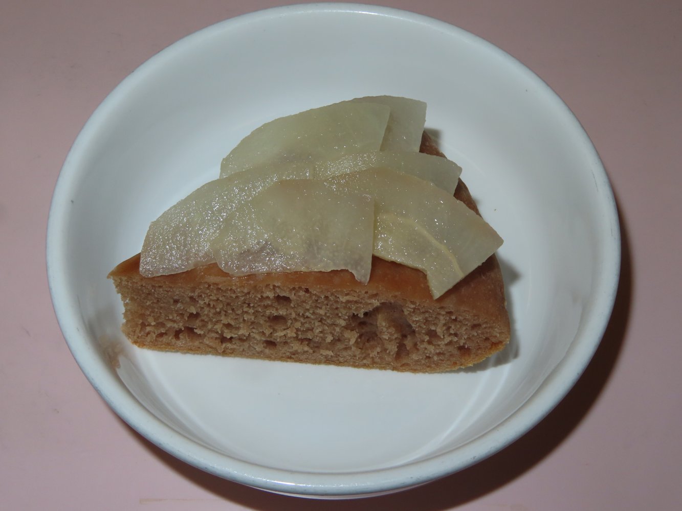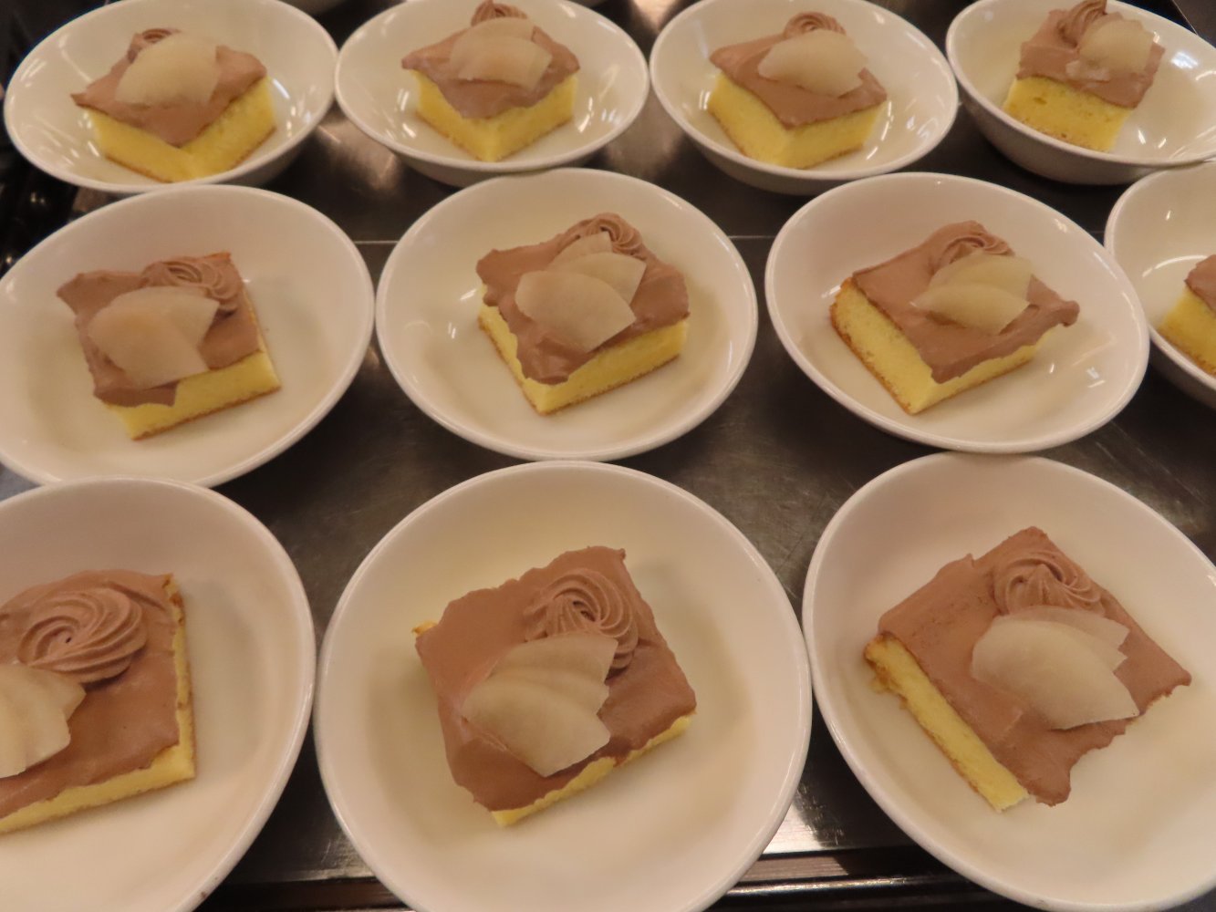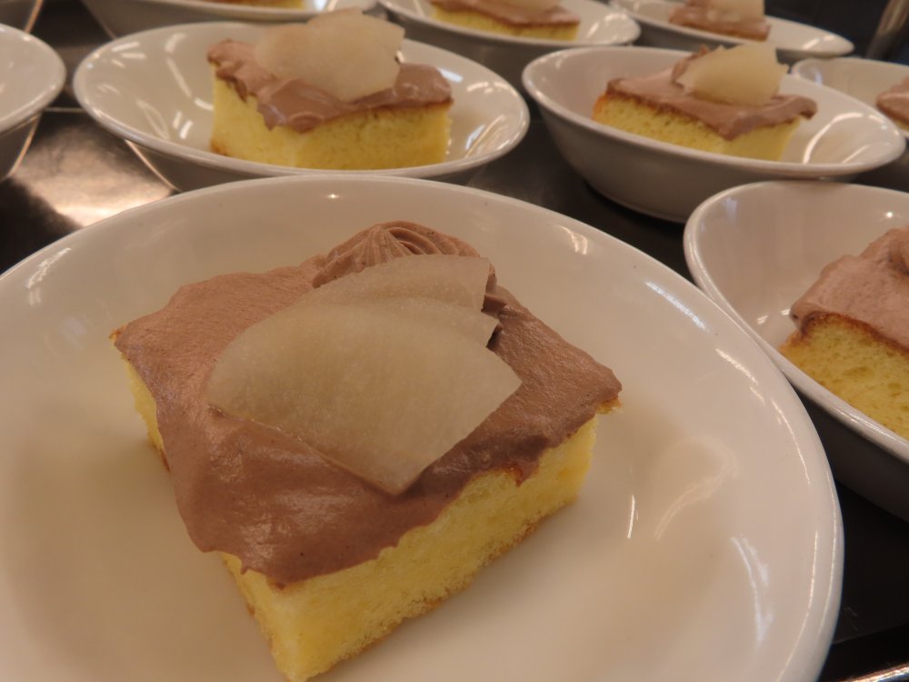 ココアクリームと梨のコンポートでデコレーションしました。