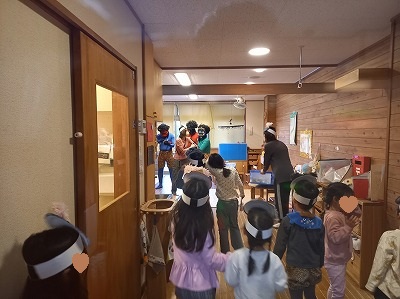子ども達は新聞紙で作った豆まきをし、鬼を追い払いました。