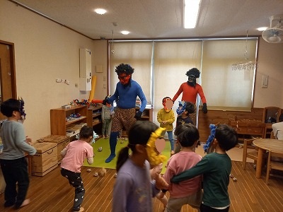 赤鬼、青鬼、緑鬼が幼児の部屋にやってきました。