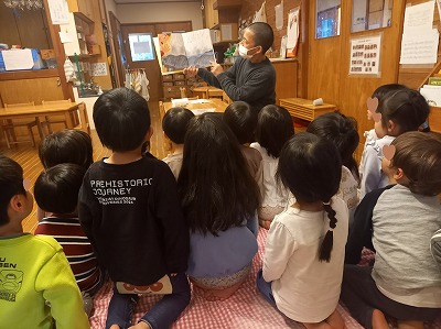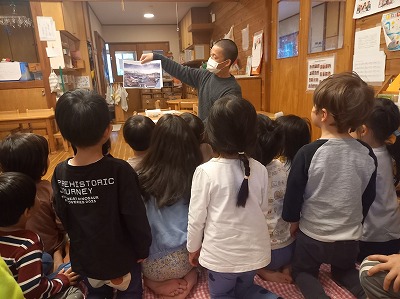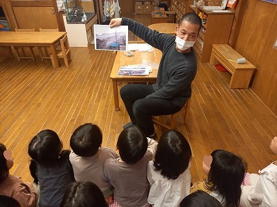 幼児クラスでは、3.11を忘れないという意味を込めて、絵本や写真を使って話をしました。